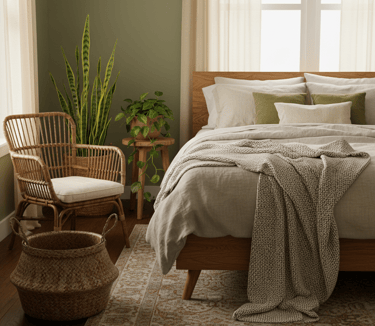 Beyond Plants: If you can't manage live plants, incorporate natural materials through furniture. A rattan armchair, a raw-edge wooden bench at the foot of the bed, or woven sea-grass baskets for laundry storage all add warmth.