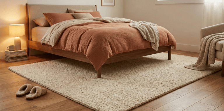 Don't overlook the floor. Stepping out of bed onto a cold, hard laminate or tile surface is a shock to the system that ruins the cozy vibe immediately. A plush area rug anchors the room and provides a thermal barrier.