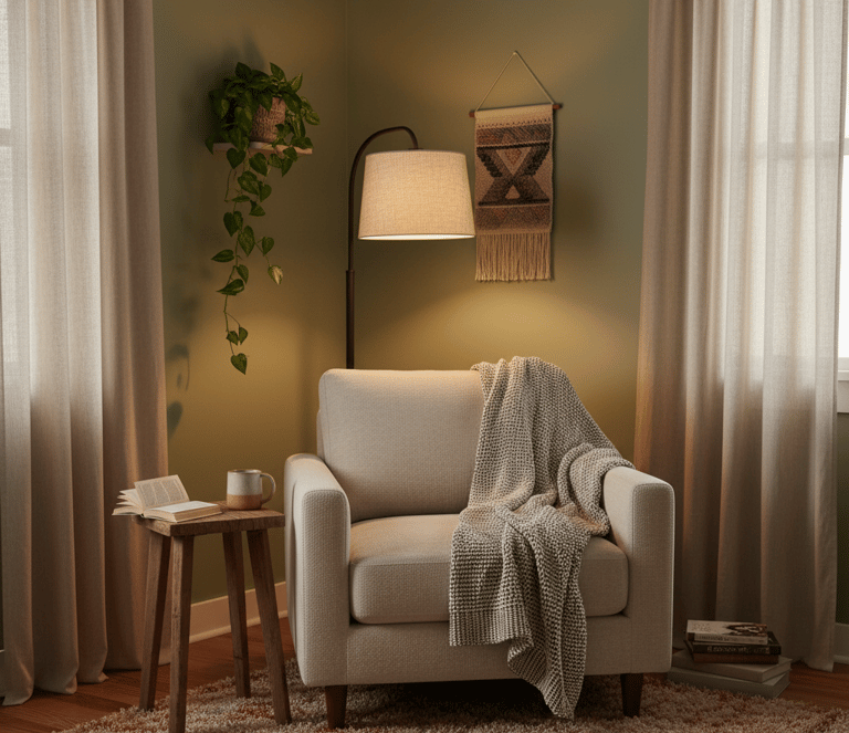 Even if your bedroom is small, designating a specific corner for relaxation helps mentally separate "sleep" from "winding down." A cozy reading nook serves as a visual reminder to disconnect from screens before bed.