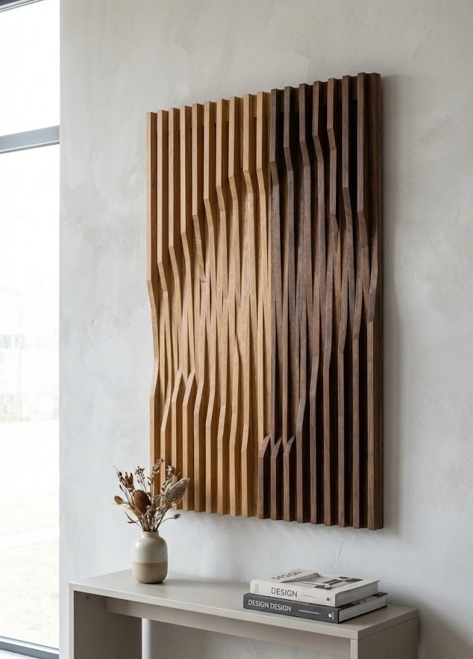 The "Wow" Factor: Play with depth by using wood pieces of different thicknesses, or stain the slats in varying shades of oak and walnut for a gradient effect.