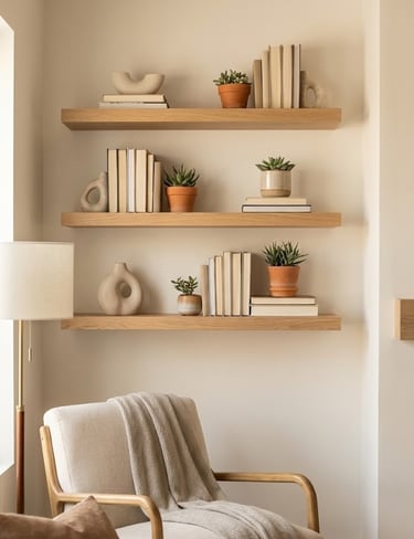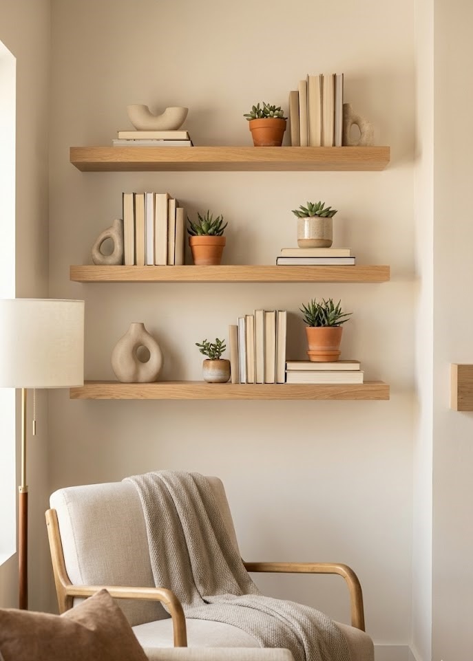 If you want a blend of utility and beauty, floating shelves are the answer. They provide vertical storage without the visual bulk of a bookcase, keeping the floor area open and making the room feel wider. They are perfect for awkward nooks or the space beside a fireplace.