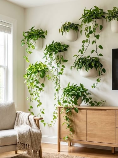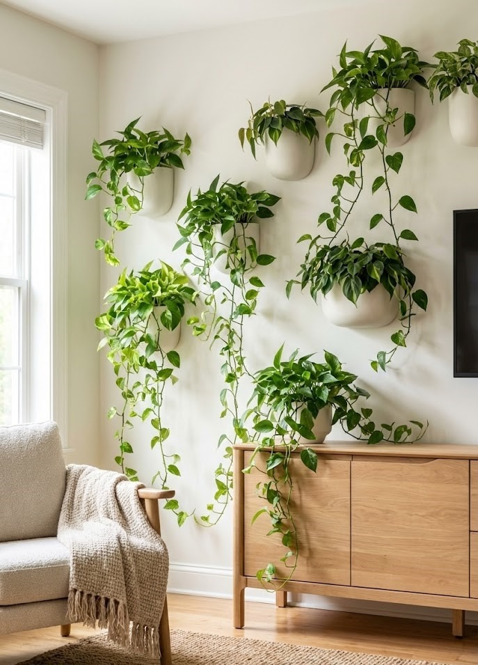 The Look: Choose uniform wall planters (e.g., three white ceramic wall pots in a vertical row) for a modern look, or macramé hangers for a bohemian vibe.