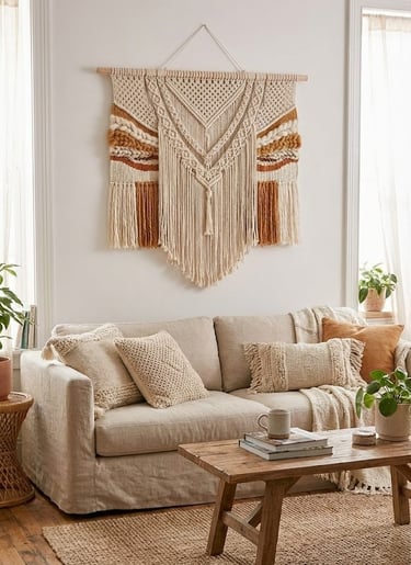 Living rooms are often full of hard surfaces: glass coffee tables, wooden floors, metal electronics, and drywall. To counter this, introduce softness with fabric wall hangings. Macramé, woven tapestries, quilts, or even framed silk scarves add warmth and acoustic dampening.