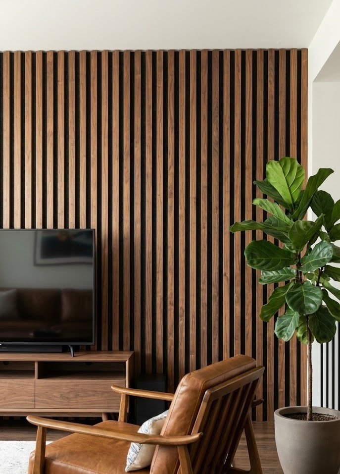 Application: A wood slat wall behind the TV can warm up a modern space and hide unsightly cords. Alternatively, applying picture frame molding to walls and painting it the same color as the wall (monochromatic) looks incredibly high-end.