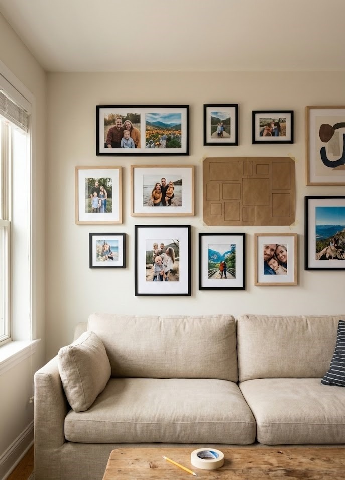 How to Style It Like a Pro: The most common mistake with gallery walls is spacing. A good rule of thumb is to keep 2 to 3 inches of space between each frame. If the spacing is too wide, the collection loses its cohesion; too tight, and it looks cluttered.