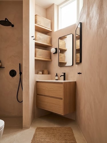 Pro Tip: Keep the ceiling bright white to prevent the "cave effect," and invest in good vanity lighting.