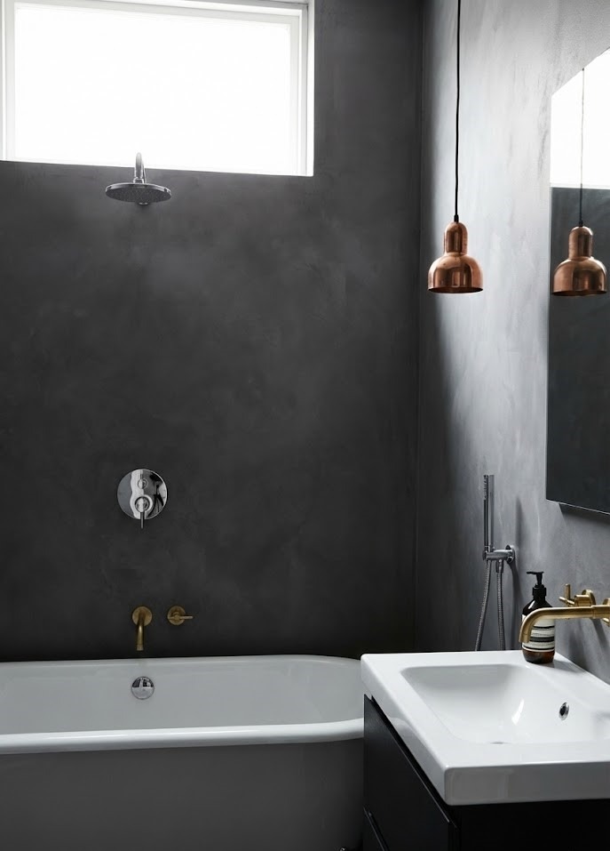 Contrast King: Charcoal walls make white porcelain sinks and tubs pop visually.