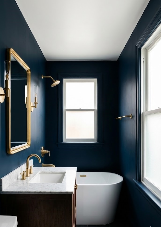 Luxury: Navy or midnight blue looks incredible against brass or gold fixtures.