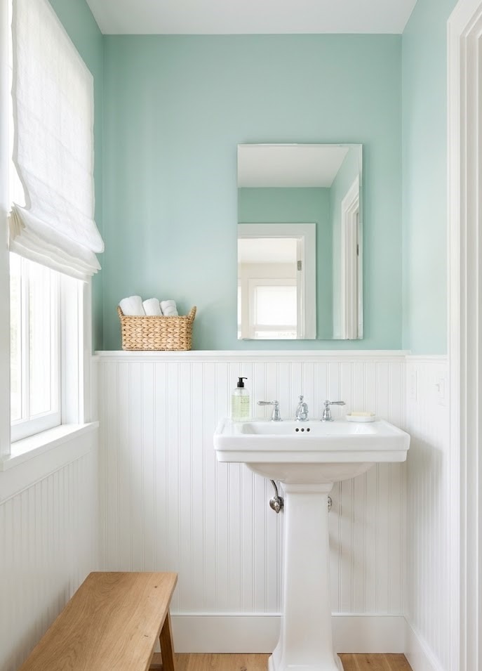 Wainscoting: If painting the whole room pink scares you, try painting just the bottom half of the wall or the vanity cabinet.