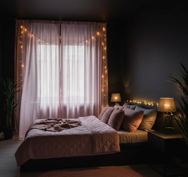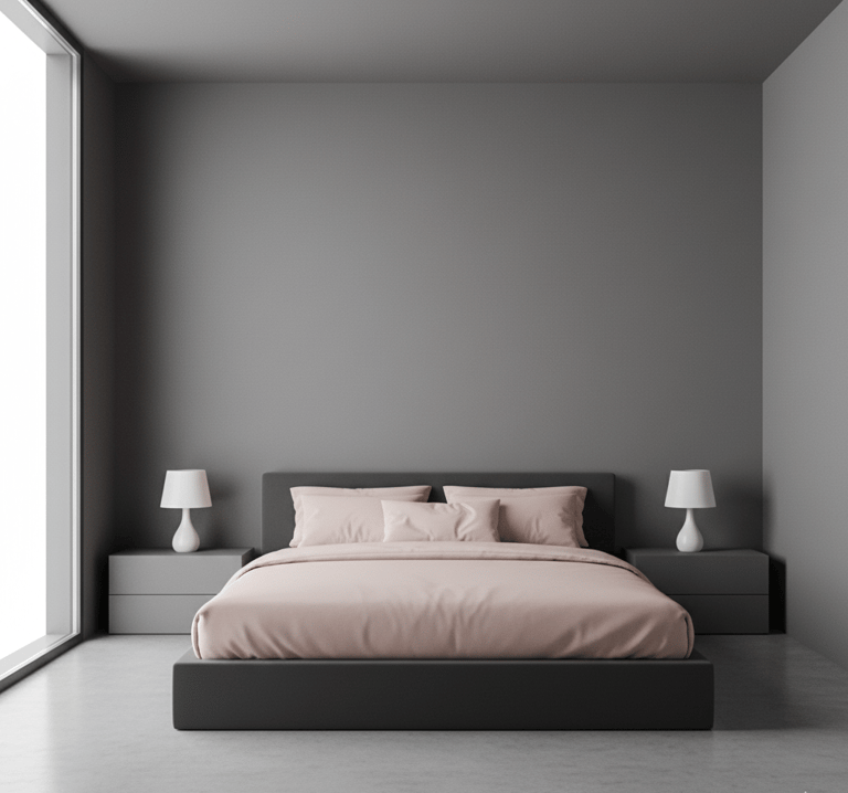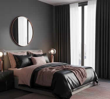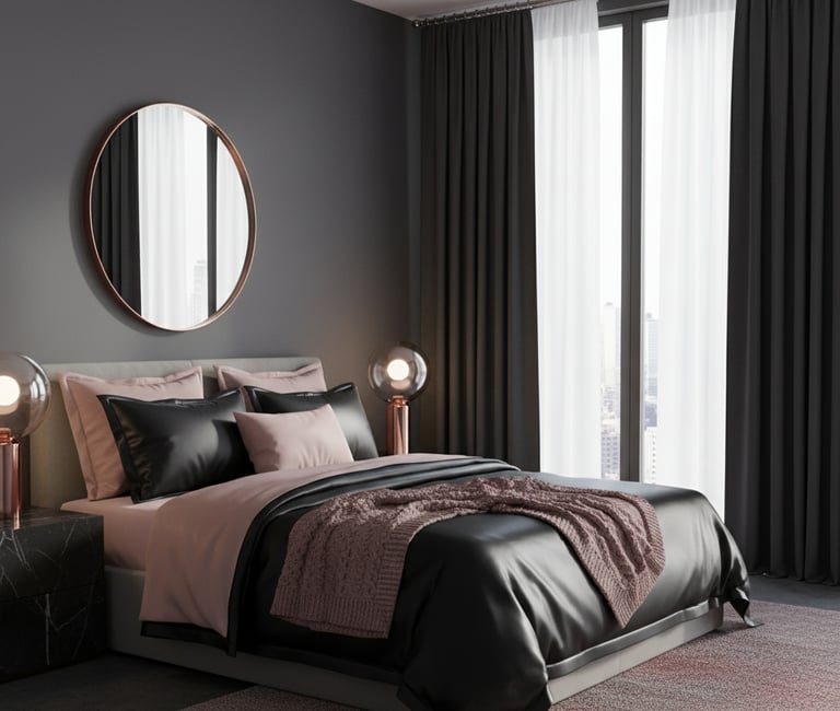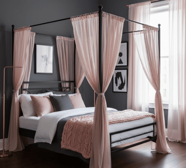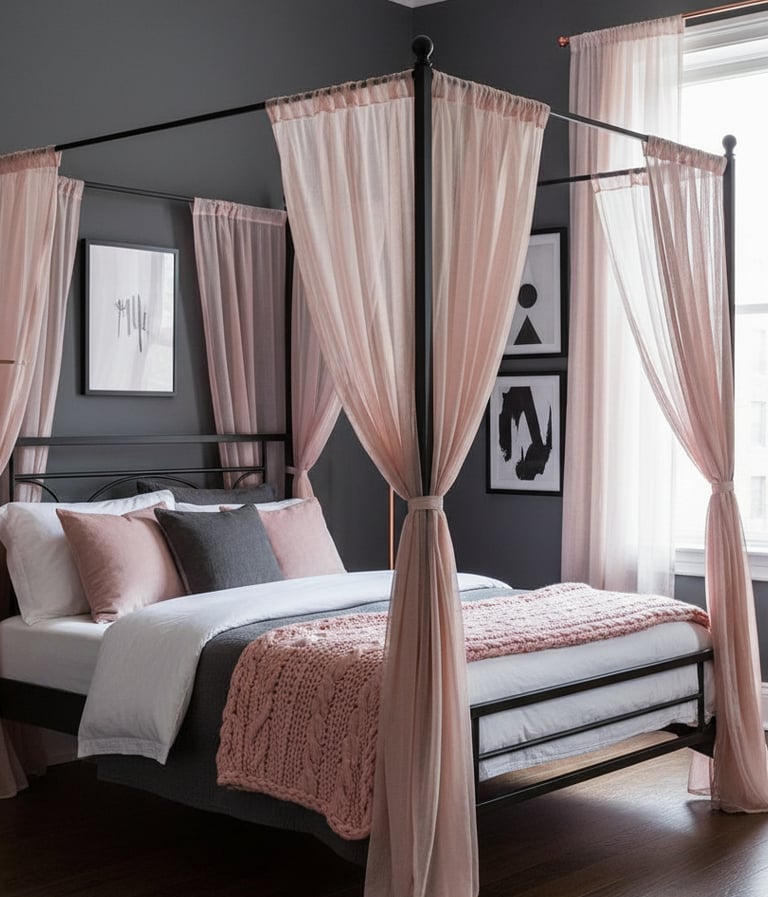 Ever wanted your bedroom to feel like a romantic movie set? This combo delivers. Matte black walls (yes, I’m suggesting black walls—stay with me) paired with the softest blush pink bedding and sheer curtains create pure magic.