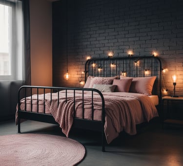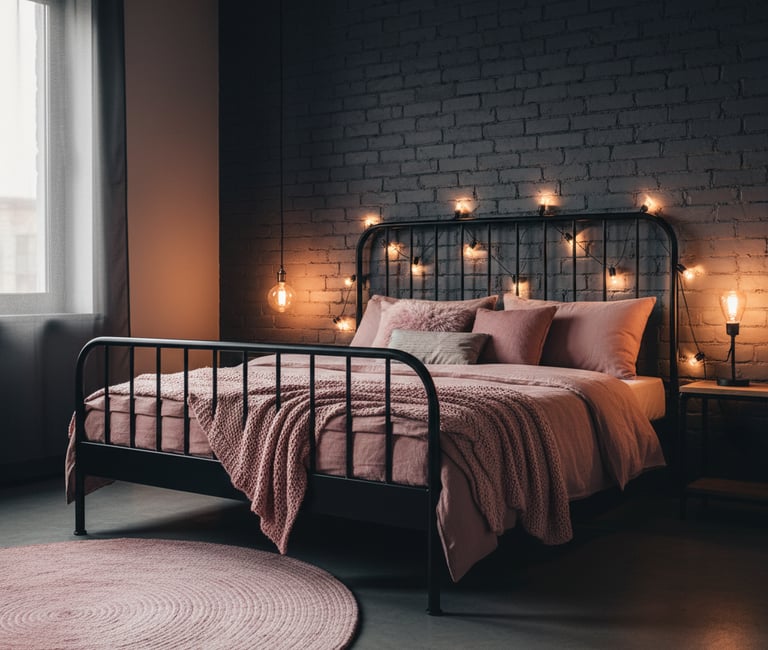 Start with industrial basics: black metal furniture, exposed bulb lighting, maybe some reclaimed wood elements. Then soften it up with dusty rose bedding, a pale pink area rug, or rose-toned artwork. The contrast between hard industrial elements and soft pink creates this amazing tension.