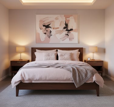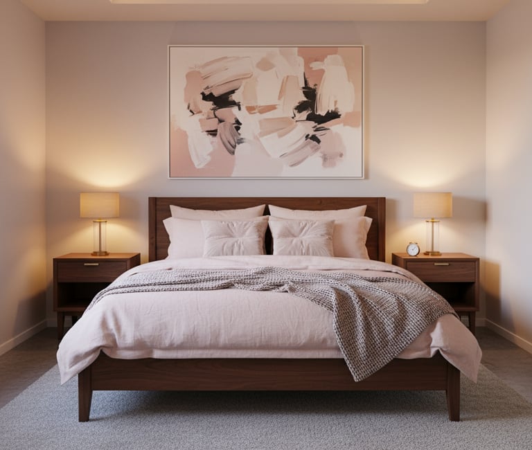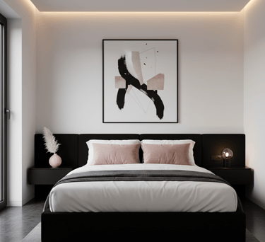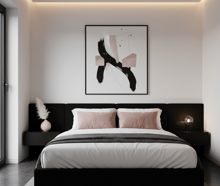Turn your bedroom into a gallery with an art-inspired approach. Think abstract patterns, geometric designs, and bold graphic elements in black and pink.