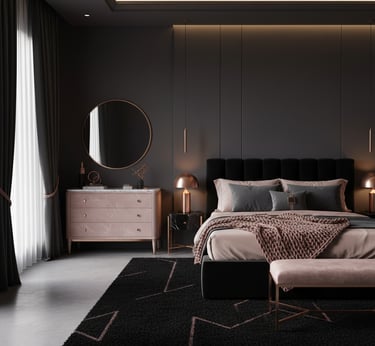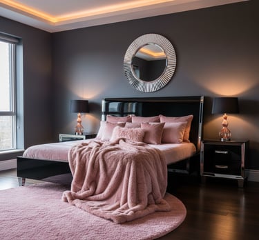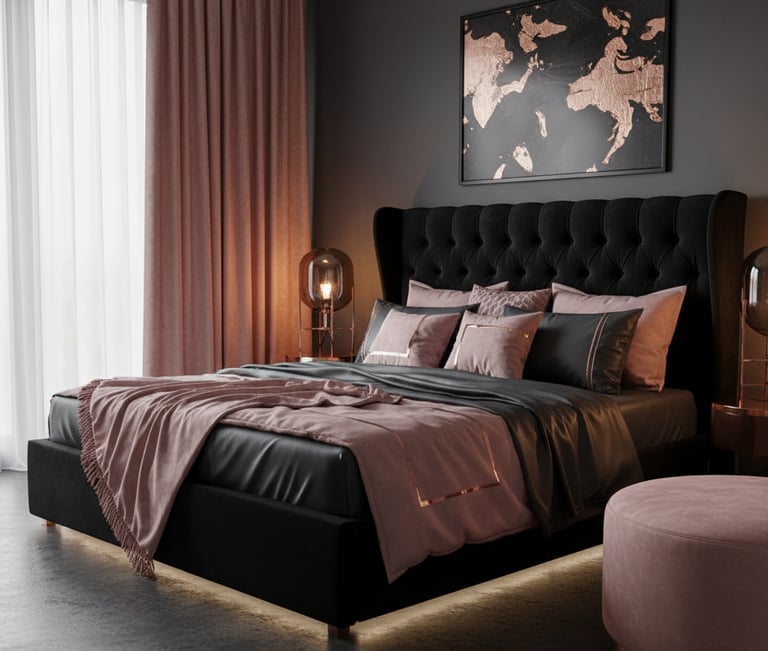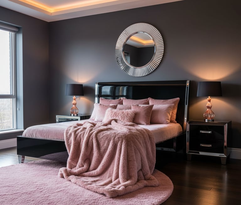 I recently helped my sister redesign her master bedroom in this style, and the transformation was insane. We started with a black upholstered bed frame—go for something with clean lines and maybe some subtle tufting. Then we layered in pink through accessories: a dusty pink area rug, some millennial pink artwork, and crystal light fixtures that caught both colors beautifully.