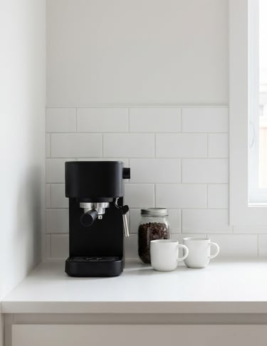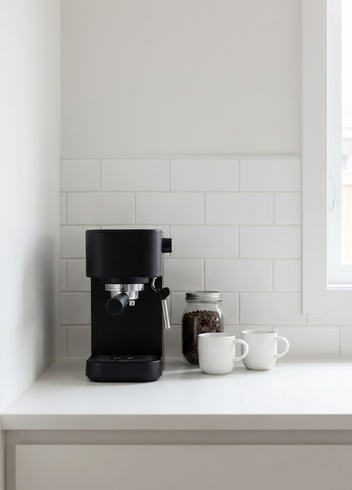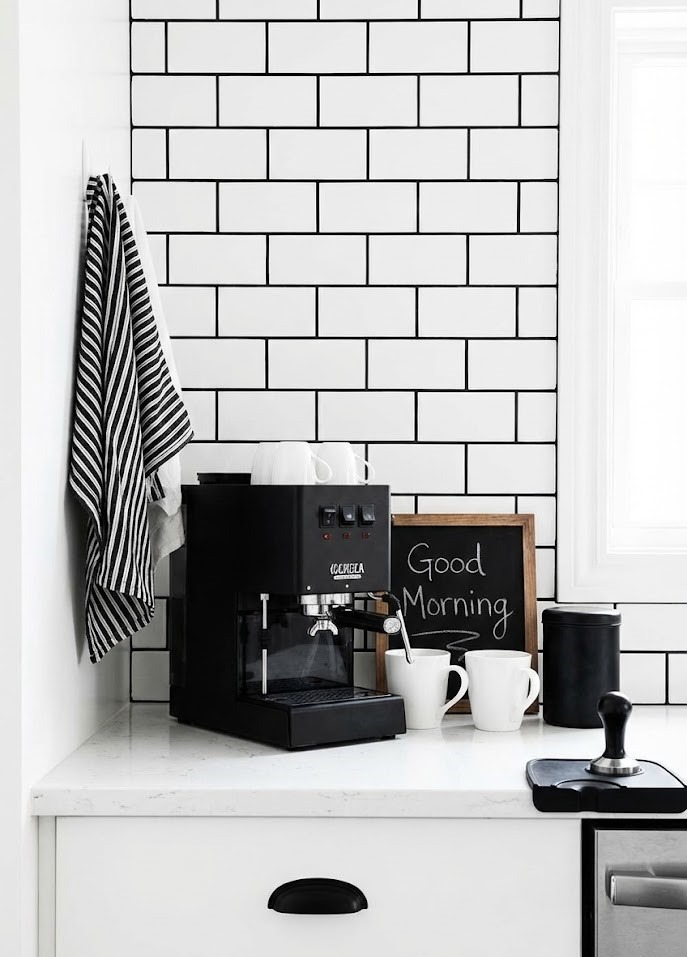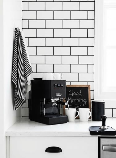 Achieve a chic, graphic look by sticking to a strict black-and-white color scheme. A matte black coffee maker looks stunning against white subway tile. Add a small chalkboard for writing "Good Morning" or the day's brew to complete the bistro aesthetic.