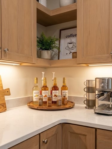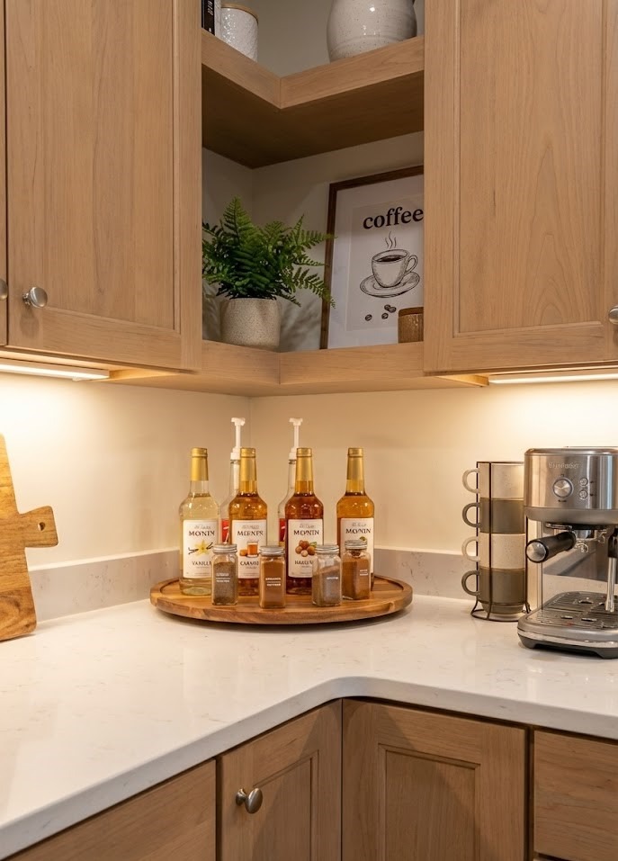 Don't let awkward kitchen corners go to waste. An L-shaped corner setup can feel incredibly tucked-away and cozy. Use a lazy Susan (turntable) to make syrups and spices easily accessible in the deep corner space. It’s a smart use of real estate that feels intentional.