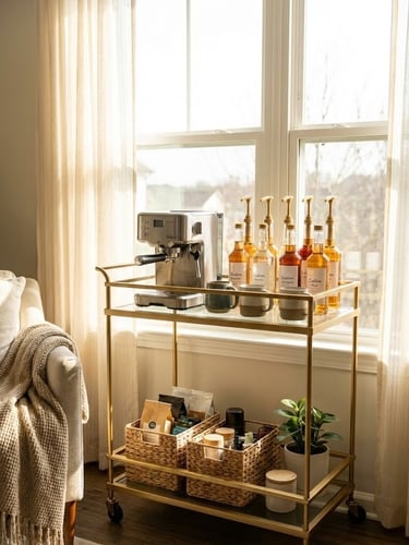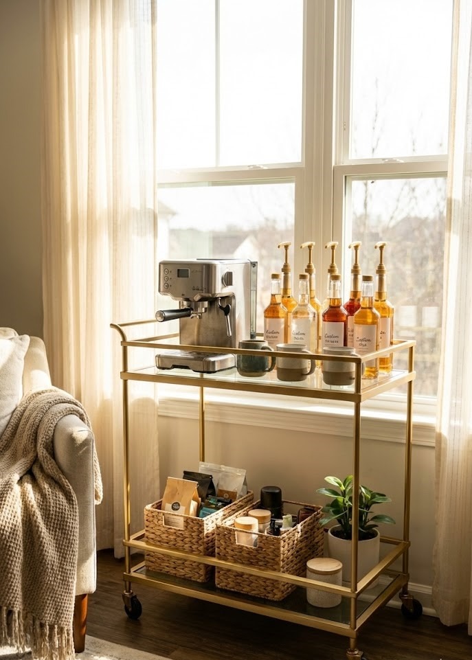 Perfect for renters or those with tiny kitchens, a rolling bar cart is a versatile solution. You can wheel it into the living room when entertaining or keep it sunny by a window. Style the top tier with your machine and syrups, and use the bottom tier for extra storage baskets and supplies.