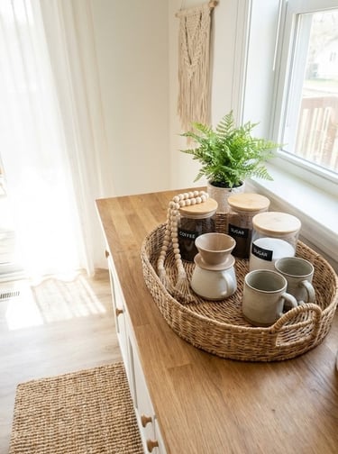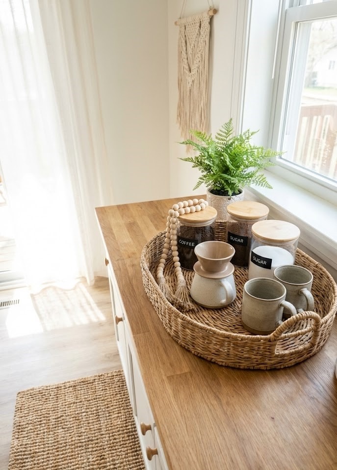 Bring the relaxed vibes of a bohemian café to your kitchen. Incorporate natural materials like a wicker tray, a small woven rug, and wooden beads. Transfer your sugar and coffee grounds into glass jars with bamboo lids to maintain the organic, airy feel.
