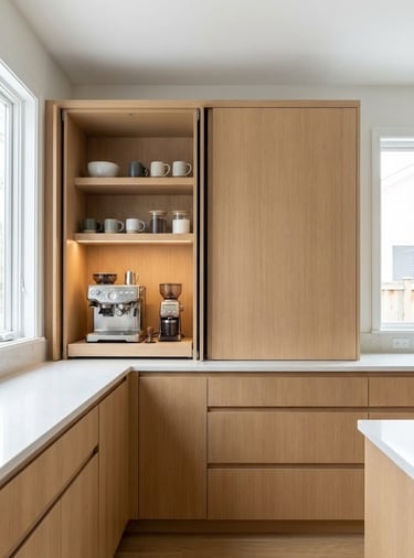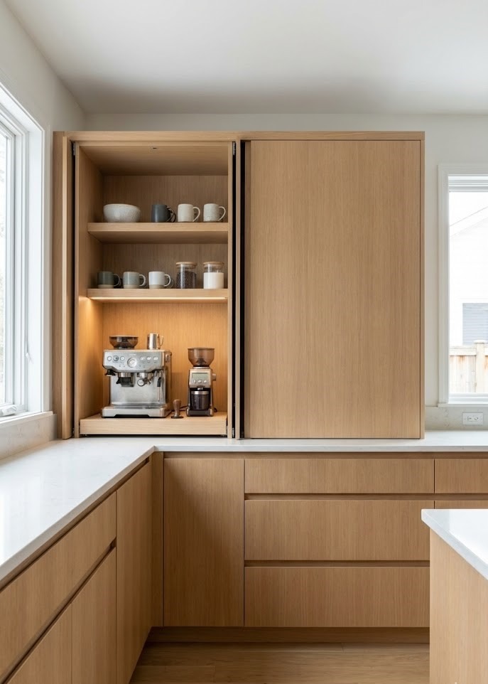For those who prefer a streamlined look, a hidden station is ideal. dedicate a cabinet with retractable doors or an "appliance garage" to house your coffee setup. When the doors are open, it's a fully functional bar; when closed, the visual noise disappears completely.
