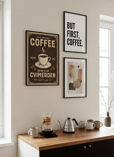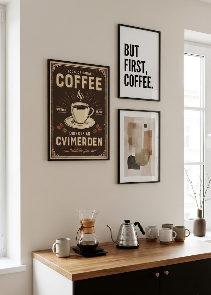 If your coffee gear is simple, let the walls do the talking. Hang a gallery of art above your station. This could be vintage coffee advertisements, typography prints, or abstract art that complements your kitchen's color palette. It defines the zone visually without taking up counter space.