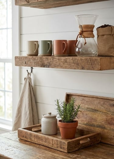 For those who love warmth and texture, a rustic theme is timeless. Use a reclaimed wood shelf or a thick wooden serving tray to ground the space. Pair this with stoneware mugs in earthy tones like oatmeal, sage, or terracotta. This style fits perfectly in farmhouse or cottage-style homes, creating a grounded, welcoming vibe.