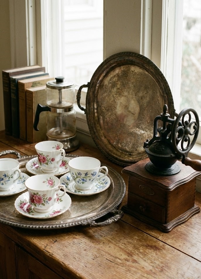 Inject some soul into your morning with vintage finds. Scour thrift stores for an antique silver tray, an old-school manual grinder, or a set of mismatched floral china. These pieces tell a story and add a layer of nostalgia that modern appliances just can't match