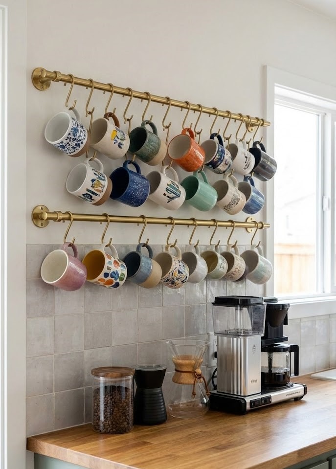 If you collect beautiful mugs, don't hide them in a cupboard! Install a brass or black metal rail with S-hooks to hang your collection. This not only frees up cabinet space but also adds color and pattern to the wall, serving as functional decor.