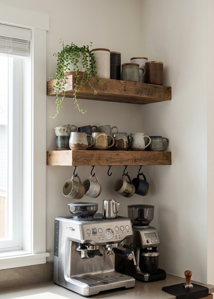 Short on counter space? Look up! Installing two or three floating shelves above your coffee maker utilizes vertical space efficiently. Use the shelves to display your mug collection, coffee canisters, and small plants. Add hooks underneath the bottom shelf to hang mugs for an adorable, café-style look.