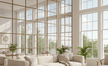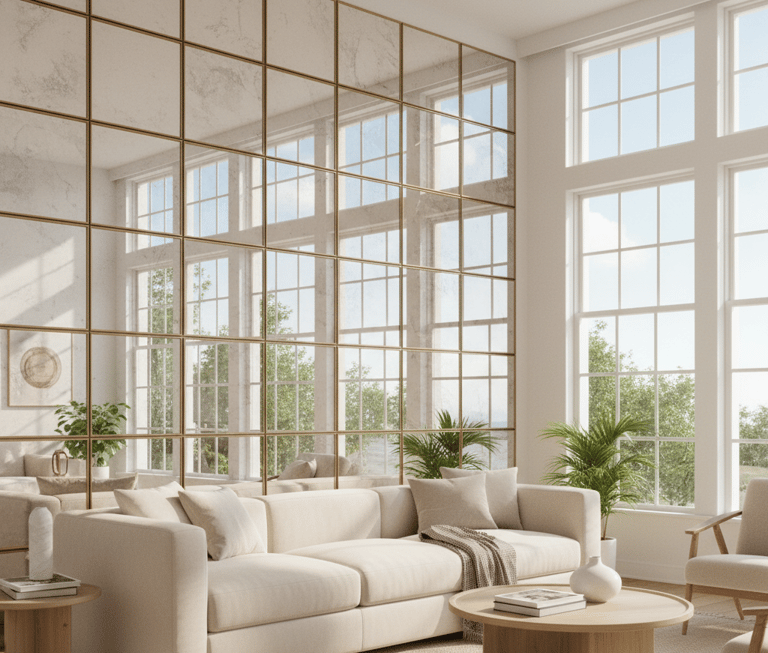 In small or dark living rooms, an accent wall made of mirror panels can be a game-changer. It will bounce light around the room and create the illusion of double the space. You can use several large, identical framed mirrors hung in a grid or have custom-cut mirror panels installed.