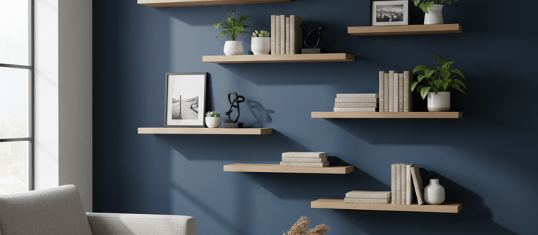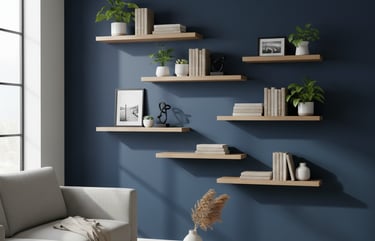 An accent wall can be both beautiful and practical. Install a series of floating shelves in an interesting, asymmetrical arrangement. The key is in the styling: mix books, small plants, and personal objects, but be sure to leave "negative space" (empty areas) so it looks curated, not cluttered.