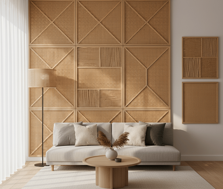 Embrace the trend of natural materials by using woven panels. You can buy pre-framed cane or rattan panels and hang them as art, or buy cane webbing by the roll and frame it yourself with thin wood trim directly on the wall. This adds a light, airy, and tactile warmth perfect for Japandi or modern coastal styles.