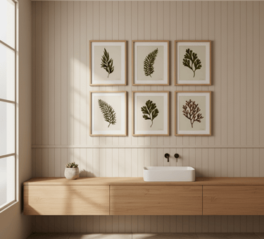 Themes can be tricky; you want to nod to the "water" element without hanging a cheesy "Beach" sign. A collection of six matching seaweed or coral illustrations organized in a clean two-by-three grid creates a sophisticated coastal vibe. Dark wooden frames provide a striking contrast against light gray beadboard or shiplap walls.
