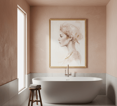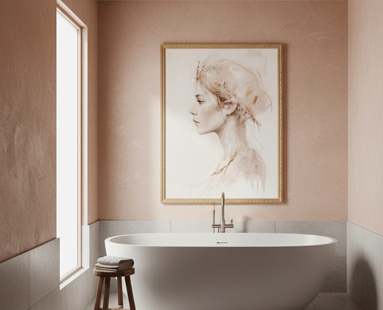 Placement: Position a large, elegant portrait beside the tub or on the wall opposite the vanity mirror.