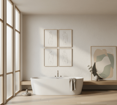 In a spacious, sophisticated bathroom, blending art styles creates a refined, eclectic atmosphere. Above the bathtub, try arranging a set of six matching figural sketches (human forms) in a tight grid. This gives the wall a structured, architectural appearance. To balance this rigidity, lean a large, vibrant abstract canvas against an adjacent wall.