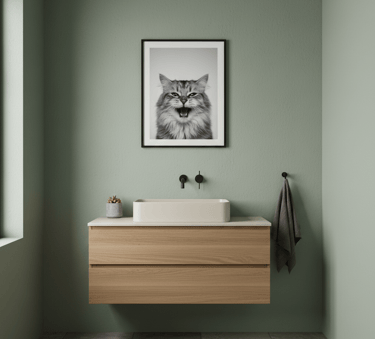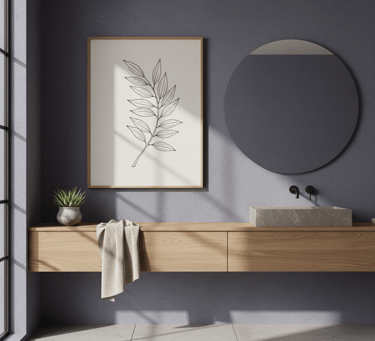 Styling Tip: To keep this look cohesive, match the frame of the wall art to the vanity material (e.g., light oak frame with light oak cabinets).