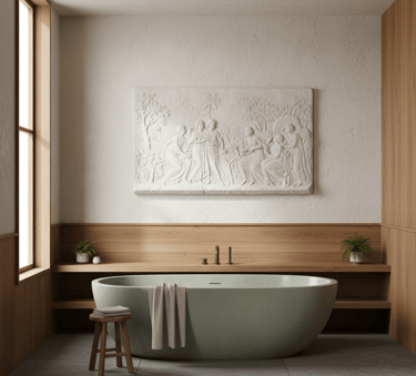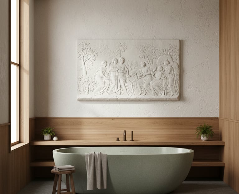 For the ultimate statement of luxury, move beyond 2D art. In an architecturally significant bathroom with a marble or stone tub, mount a classical bas-relief sculpture on the wall. The light-colored, three-dimensional texture of plaster or stone creates a powerful contrast against dark, sleek marble.