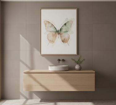Styling Tip: When hanging art over a vanity, ensure the bottom of the frame is at least 6 to 8 inches above the backsplash or faucet to avoid water splashes.