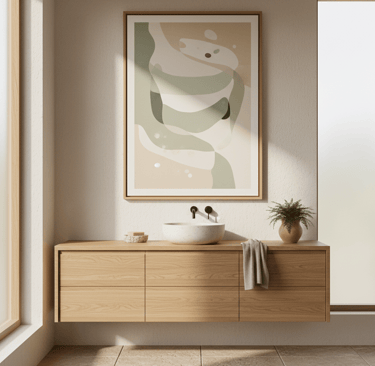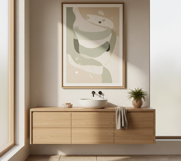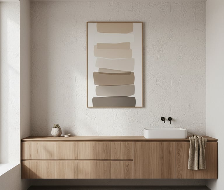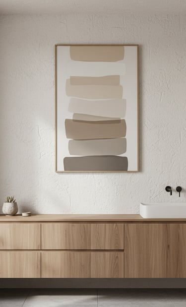 This calm bathroom design is built on minimalism and a muted, earthy color palette. The chosen artwork is a large, vertical abstract print that features a simple, textured horizon line in tones of beige and rust. These colors perfectly echo the natural wood used in the vanity and door, preserving the room's tranquil feel. A simple, light wood frame helps the piece integrate smoothly with the textured wall. This demonstrates that art can create an impact through subtle texture and color variations, not just with bright or busy images.