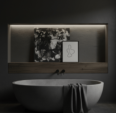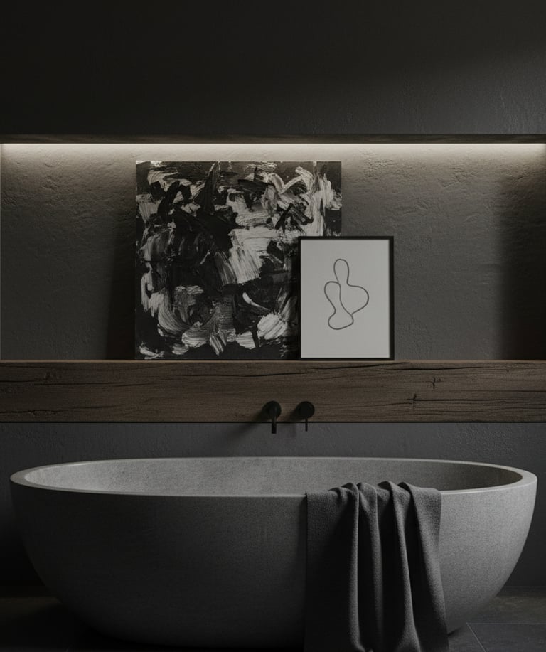 In this design, a large, textured abstract piece with a light finish is placed on a recessed shelf above the tub, acting as a soft background. A second, smaller print with a dark frame is set in front of it. This technique of layering adds visual interest and dimension, especially against the flat black walls. The art provides a necessary contrast to the deep wall color and the simple tub. It demonstrates that texture and scale can be just as impactful as bright, bold colors.