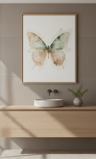 This bathroom features a large, striking watercolor of an insect, like a moth or butterfly. The painting's earthy colors, such as olive green and brown, harmonize beautifully with the vibrant green tiles and patterned wallpaper. A simple dark frame helps the artwork hold its ground against the busy wallpaper backdrop. Opting for one large, significant piece often creates a stronger effect than scattering several smaller items. This approach establishes a single, undeniable focal point for the room.