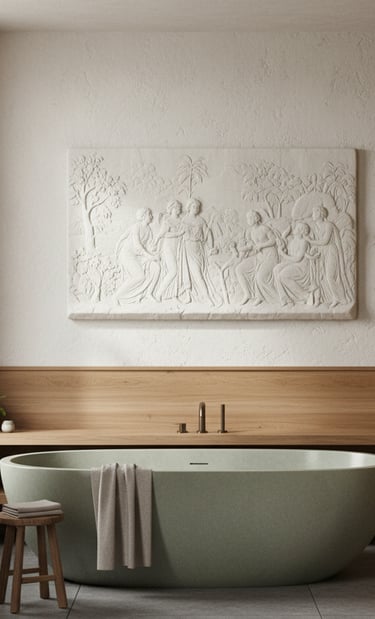 This architecturally significant bathroom includes a striking soaking tub made of dark green marble. The "artwork" chosen for the space is a classical bas-relief sculpture mounted on the wall above the tub. The light-colored, three-dimensional texture of the sculpture creates a powerful contrast against the dark, sleek marble. This unconventional choice instantly lends a sense of history and classic sophistication. Employing a significant, non-traditional art form like sculpture can elevate the entire bathroom to the level of a private gallery.