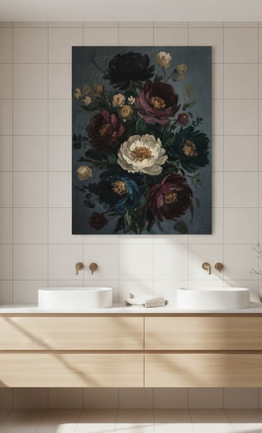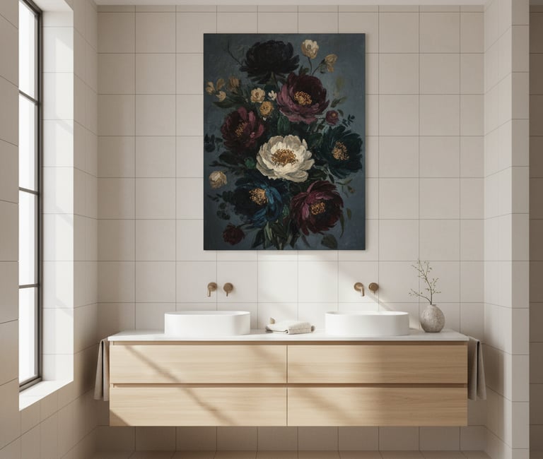 In this bathroom, the art is a canvas print of a floral still life with a dark, moody background, similar to a classic Dutch painting. The contrast between the deep background and the bright, vivid flowers creates a stunning sense of depth. Hung against a clean white plank wall, the artwork's colors stand out dramatically. This style of art lends an air of sophistication and luxury. Using a canvas print is also a practical choice, as it avoids glass, which can fog up or trap moisture in a humid environment.