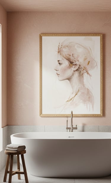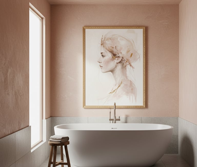 This space uses a lovely color-blocking method, with a deep terracotta pink on the top half of the wall and cool gray tile on the bottom. The art is a large, soft portrait featuring pale pink, gold, and cream hues. It serves as a beautiful focal point that cleverly connects the two main wall colors. The gentle tones within the painting help to soften the intensity of the bold terracotta paint. Positioning a large, elegant portrait like this beside the tub infuses the room with a feeling of luxury.