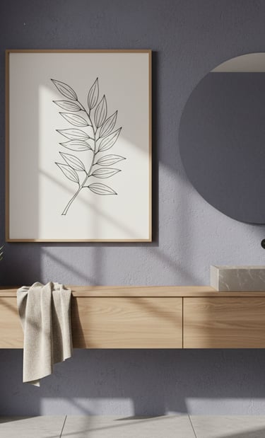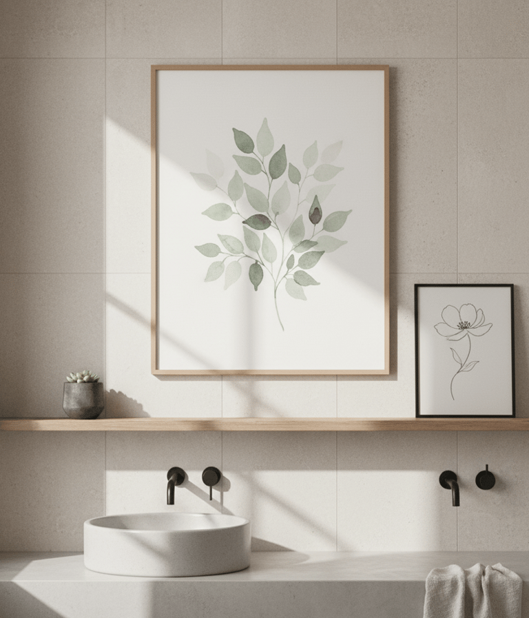 Botanical prints are a wonderful way to add a soft, natural element to a bright bathroom. In this example, a framed watercolor of a hydrangea is hung on the wall in a simple wood frame that matches the neutral tones. On a surface below, a small, modern canvas featuring a minimalist black and white floral sketch is casually leaned. Combining a traditional framed print with a propped modern canvas creates a curated, thoughtful look. This shows that artwork can make a subtle yet significant impact in a minimalist setting.