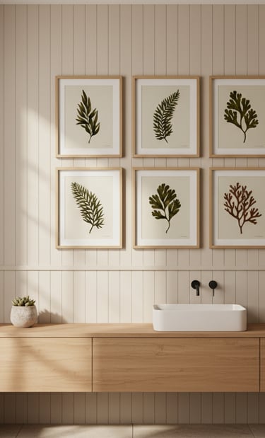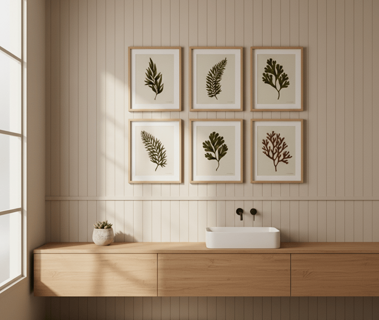 Here, a collection of six matching seaweed illustrations is organized in a clean two-by-three grid. The dark wooden frames create a striking contrast with the light gray vertical beadboard walls. The choice of seaweed botanicals as a subject is particularly appropriate for the bathroom setting. Arranging prints in a tight grid provides a structured, polished appearance that instantly upgrades the room. This method of grouping the prints together creates a much stronger visual statement than if they were hung separately.