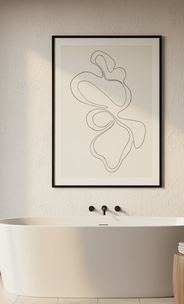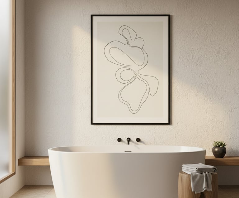 This setup highlights how effective minimalist art can be in a serene, uncluttered room. A single, small framed print is placed just above a modern freestanding tub. The artwork is a simple, single-line drawing of a figure on textured paper. Its small scale is a deliberate choice, offering a focal point that doesn't overwhelm the room's clean lines. This piece complements the neutral walls and dark wood vanity, lending a bit of organic warmth. It's a clear example that bathroom art doesn't need to be large to be impactful.