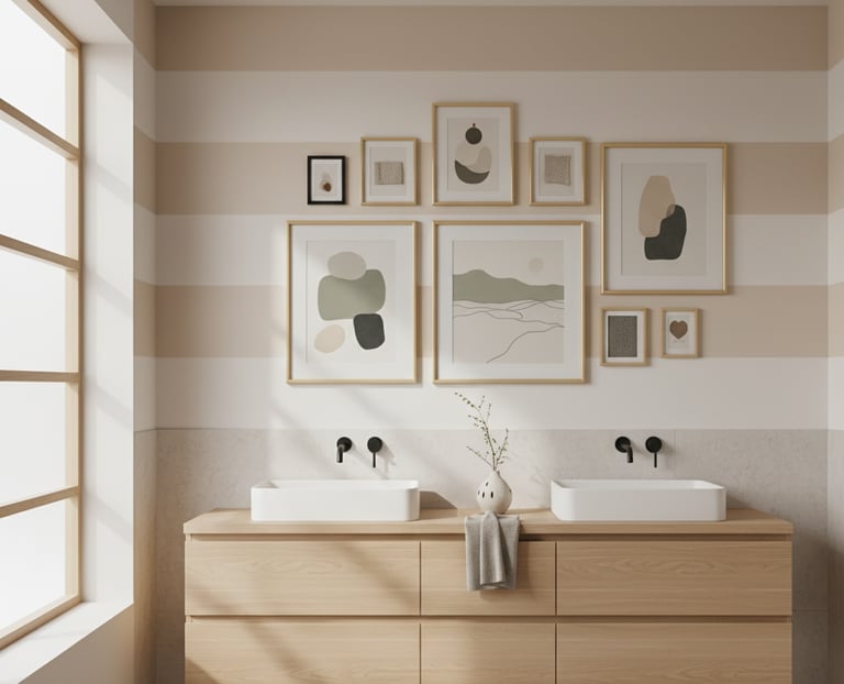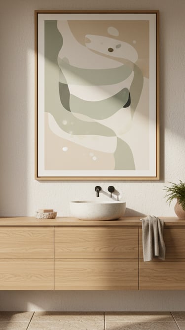 The Look: Pair a warm-toned abstract print with brass hardware and a natural wood vanity for an "organic modern" aesthetic.