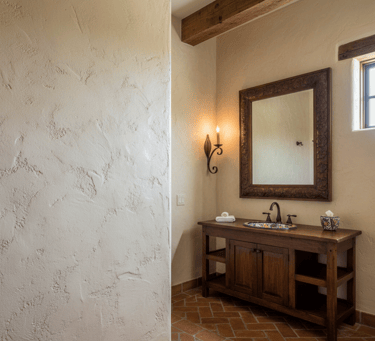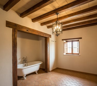 Adding exposed wooden beams is an excellent way to introduce rustic warmth to a Spanish-style bathroom, reminiscent of a traditional Spanish villa. Using reclaimed or distressed wood will give the space a more authentic feel. Install them across the ceiling to add architectural interest or use them to frame an alcove for the bathtub. These beams create a beautiful contrast with light-colored plaster walls and draw the eye upward, making the room feel more spacious.