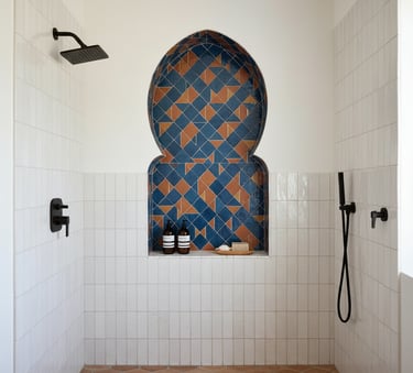 Incorporate arched niches into your shower or bathtub walls for a feature that is both beautiful and practical. These recessed shelves provide elegant storage for shampoo bottles and soap, eliminating clutter. Frame the niche with plaster or line it with contrasting mosaic tiles to make it a decorative accent. This small architectural detail strongly reinforces the Moorish-inspired aesthetic.