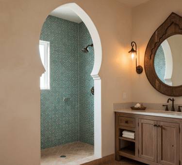 Graceful arches are a defining feature of Moorish architecture and a key element in Spanish design. Incorporate these elegant curves in doorways, mirror frames, or as an entrance to a walk-in shower. Using textured plaster or stucco to frame the arch enhances its timeless, old-world charm. This architectural detail adds a sense of sophistication and grandeur, making your bathroom feel more luxurious.