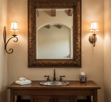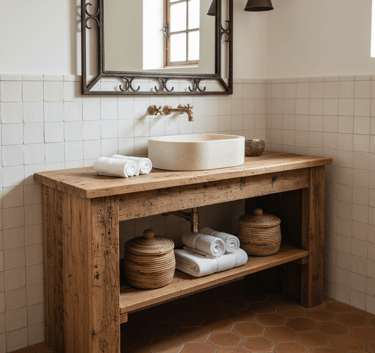 A rustic wooden vanity provides a grounding element with its natural texture and warmth. Look for a piece made from reclaimed wood or one with a distressed finish to capture the essence of a Spanish hacienda. This style pairs perfectly with both modern vessel sinks and traditional hand-painted basins. Incorporate open shelving below to store towels or display decorative baskets.